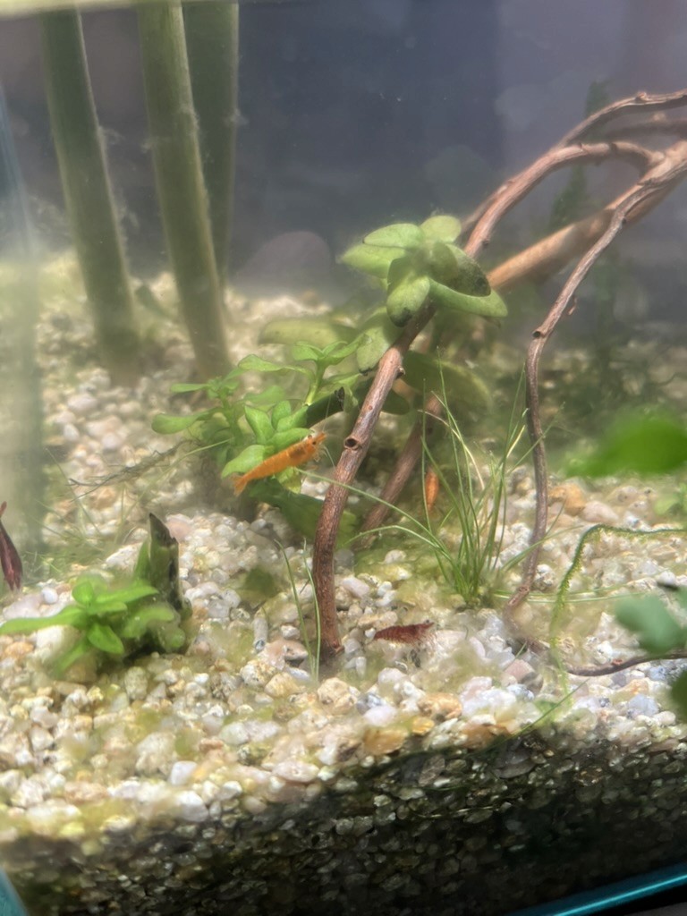 ずっとマングローブを育てていた水槽にメダカとエビを入れた。かわいいね
